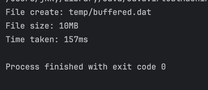 우리가 직접 만들었던 Buffer활용 스트림 방식보다 시간이 생각보다 더 걸리는 느낌이다. 이는 멀티스레드를 위한 동기화 문제를 해결하기 위한 코드가 함께되서 그러하다. 보통 이정도 속도도 매우 빠른 것으로 간주하기에 스트림에서 버퍼를 이용할 때에는 자바에서 제공하는 이 BufferedOutputStream를 사용하게 된다.