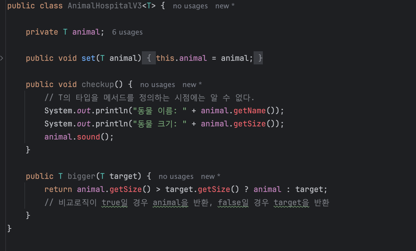 위와 같은 동물병원 제네릭 클래스를 만들려고 했다. 이전 포스팅에서 느낄 수 있듯이 만약 동물병원의 set()의 매개변수를 Dog이나 Cat으로 제한한다면, type마다 동물병원 클래스를 만들어줘야 할 것이다. 이를 방지하고자 Dog,Cat의 부모인 Animal로 받는다면, sound()메서드를 사용하지 못하는 것, set에 Cat이 들어왔는데 bigger에서 리턴된 Animal을 Dog로 받도록 코드를 짜도 컴파일 오류를 내지 않는다.