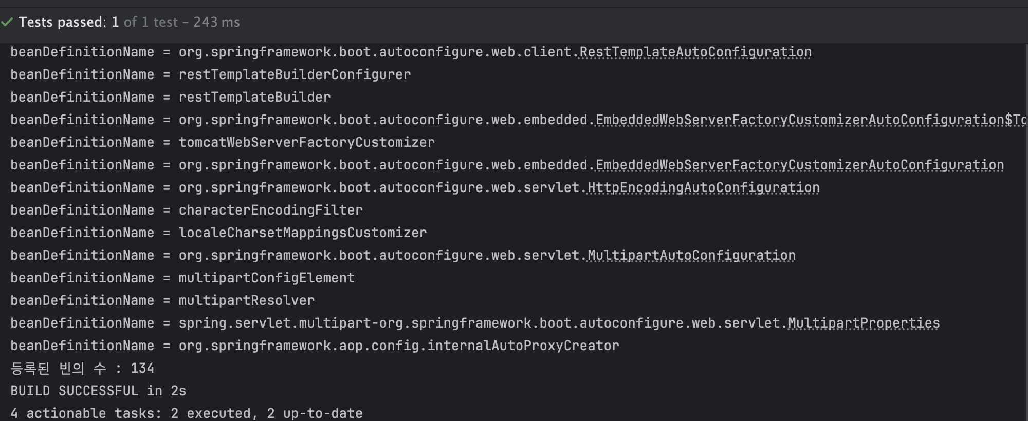 dependency에 starter-web, lombok, starter-test만을 구축해놓고 테스트를 통해 스프링을 띄울때 빈 객체를 콘솔에 찍어본 결과는 다음과 같다.