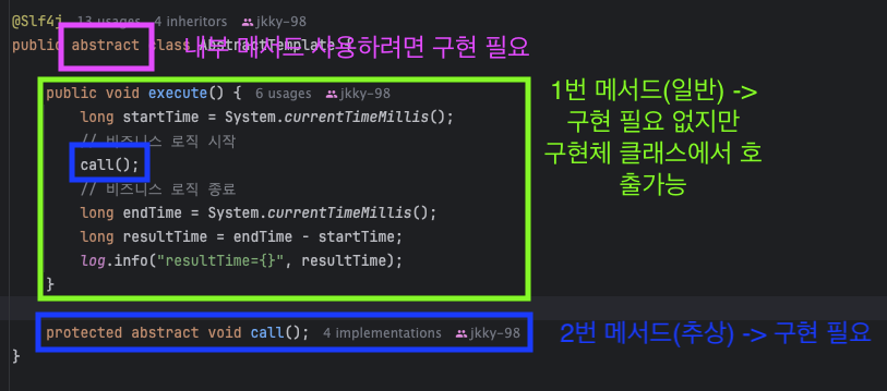 execute() 내부의 call()메서드는 AbstractTemplate의 추상 메서드로 오버라이딩 메서드를 강제한다.