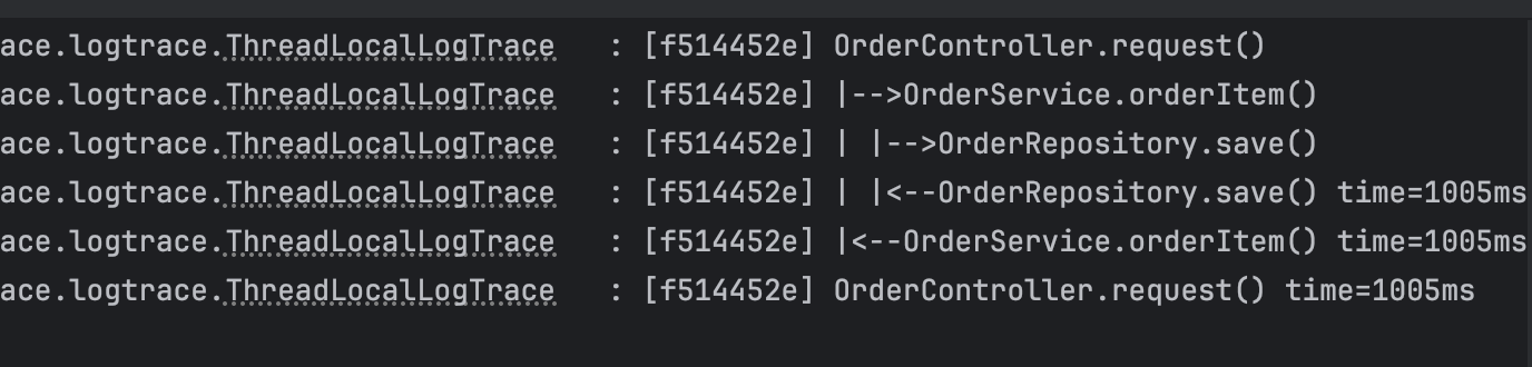 우리가 만든 LogTrace를 컨트롤러에 적용하는 단계이다. 빈으로 등록한 LogTrace 구현체를 주입받아 해당 컨트롤러 메서드 실행시 로그 기능이 작동하도록 코드를 짰다. orderService로 LogTrace를 넘겨 다음 호출에 있어서도 로그기능이 동작하여 하나의 비즈니스 로직 싸이클이 로그로 남도록 기능하고 있다.