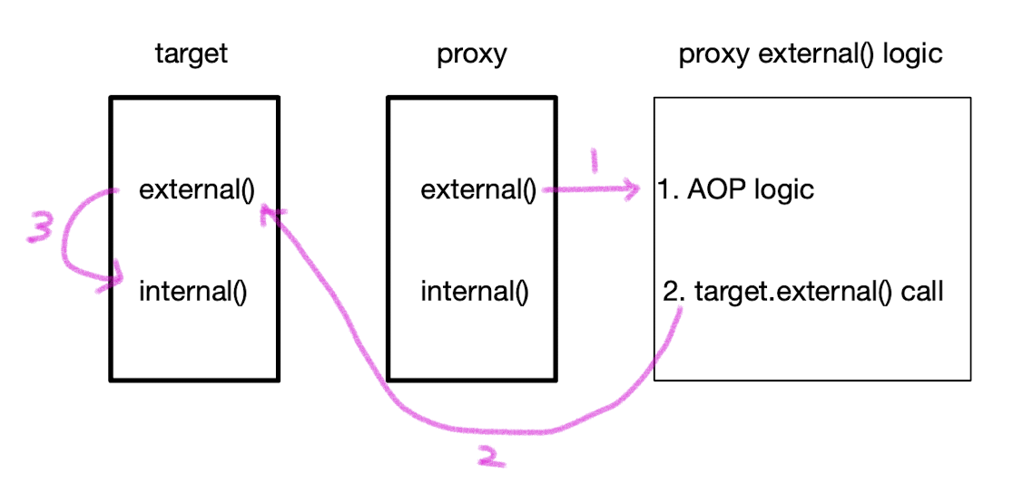 external() 내부에서 실행된 internal()에 대해 AOP가 동작하지 않고있다. 자세히 따져보자면 internal()은 빈으로 등록된 프록시.internal()가 동작한 것이 아니라 타겟.internal()이 동작한 것이다.