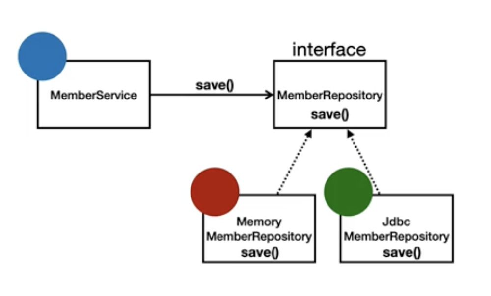 만약 MemoryMemberRepository 타입으로 직접 사용한다면, 실행에는 문제가 없겠지만, 이후 XxxMemberRepository와 같은 새로운 구현체가 추가되었을 때, 기존 코드를 수정해야 하는 상황이 발생할 수 있다. 반면, MemberRepository 인터페이스를 기준으로 설계하면, 어떤 구현체가 추가되더라도 수정 없이 새로운 구현체를 사용할 수 있다.