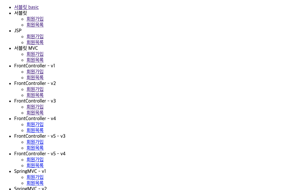 로컬호스트 URL로 바로 접근시 보이는 html문서로 여러 버전의 회원가입, 목록조회가 가능하다.