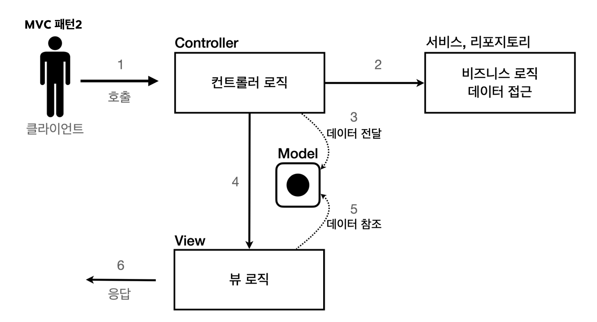 M(Model): 뷰에 출력할 데이터를 담는다.V(View): 모델에 담긴 데이터를 사용해 화면을 렌더링하는 역할(HTML 생성).C(Controller): HTTP 요청을 받아 파라미터 검증, 비즈니스 로직 처리,실제 실무에서는 컨트롤러에 비즈니스 로직을 두지 않고,