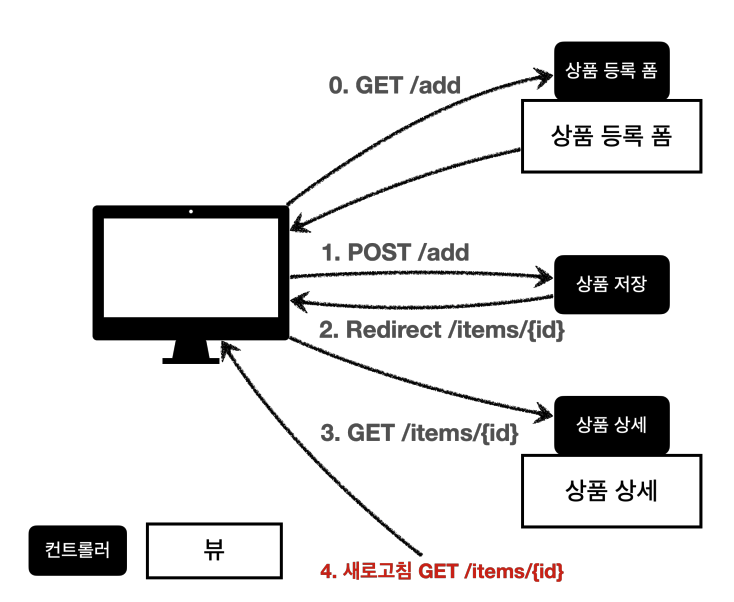 이때, 사용자가 브라우저에서 새로고침을 하면 가장 최근의 요청이 다시 실행되는데, 이 요청은 POST 요청이다. 새로고침을 여러 번 하면 동일한 POST 요청이 반복적으로 전송되어 상품이 중복 저장되는 문제가 발생할 수 있다. 이러한 문제를 방지하기 위해 PRG(Post/Redirect/Get) 패턴을 적용한다.