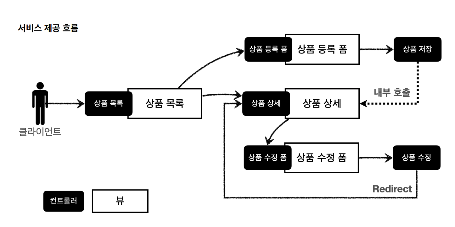 상품 저장이 이루어지기 위해 사용자는 상품 등록 폼에서 저장 버튼을 누른다. 저장 버튼이 눌리면 submit 동작에 의해 form에 설정된 action의 URI로 POST 요청이 전송된다. POST 요청을 처리하는 컨트롤러는 비즈니스 로직을 수행한 뒤, 상품 상세 정보를 포함한 템플릿을 브라우저에 반환한다.