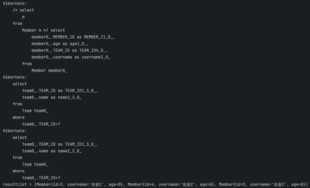 위의 jpql의 경우 Member 엔티티(연관필드 LAZY 설정)들을 모두 조회하면서 team도 같이 가져오는 것이다.