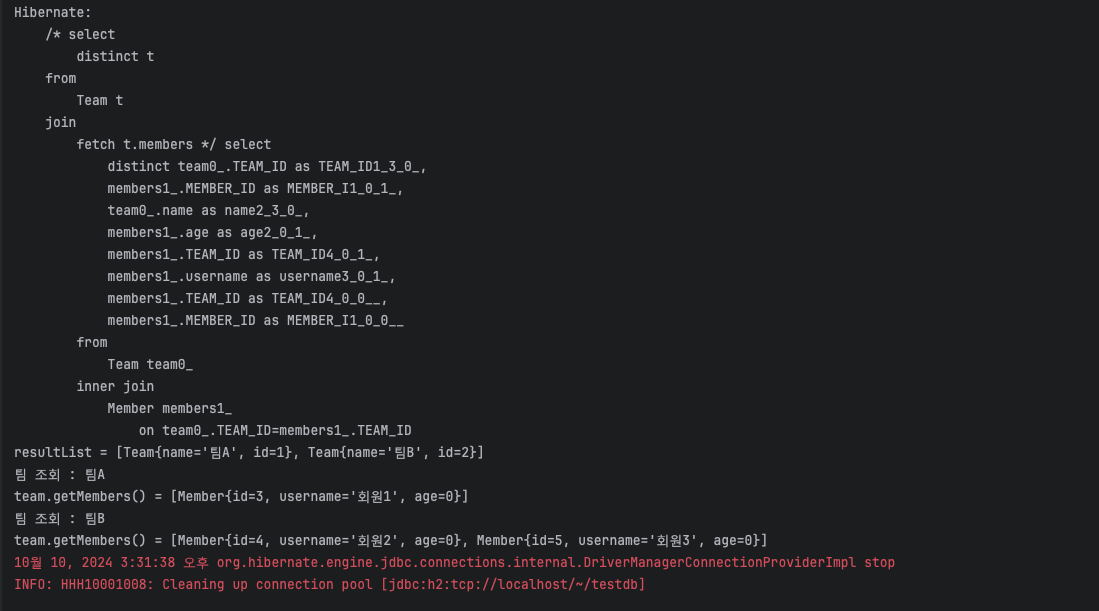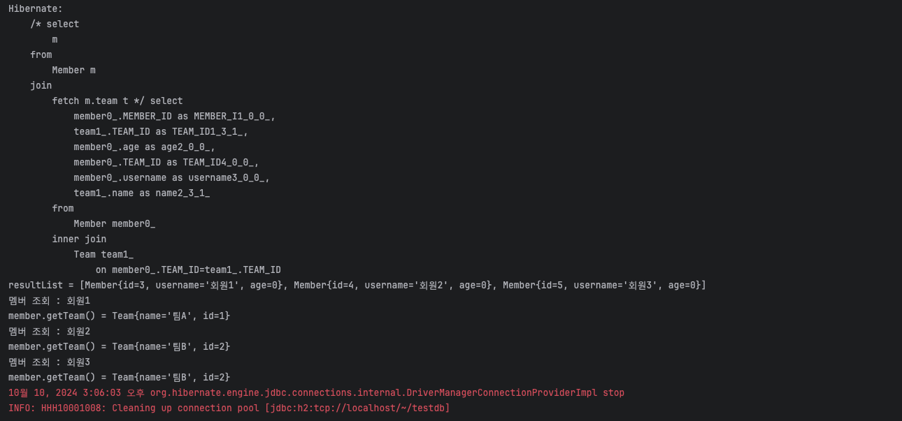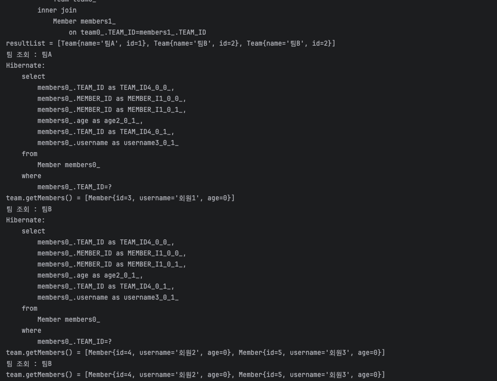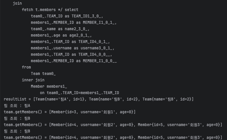 Member를 조회할 때랑 달리 join에 의해 Team에 대해 inner join으로 Member가 붙게 된다.