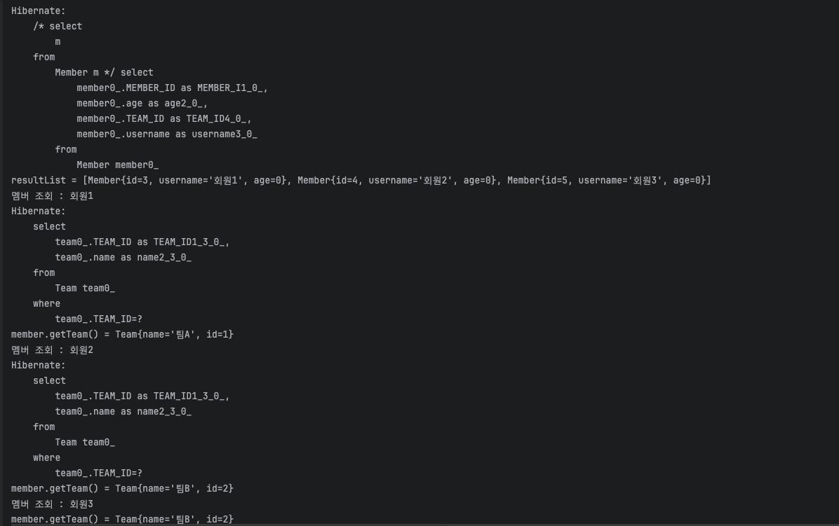 총 3번의 쿼리가 나갔다. 처음에 멤버를 조회했을 때 연관된 team까지 모두 조회되었기 때문이다. 즉시로딩이 된 것이다.