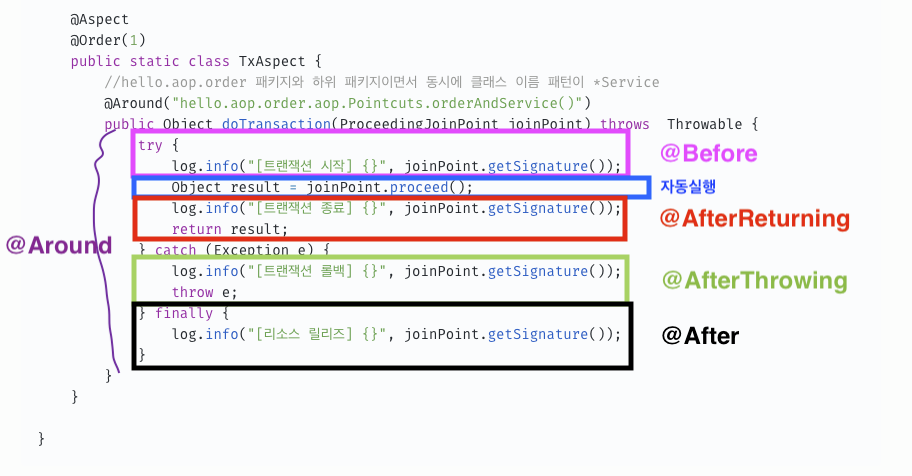 위 예시에서는 트랜잭션안에 로그를 띄우는 것이 자연스러울 것이므로 doTransaction의 proceed() 시점에서 다음 doLog가 수행되는 것이 순서상 자연스럽다.