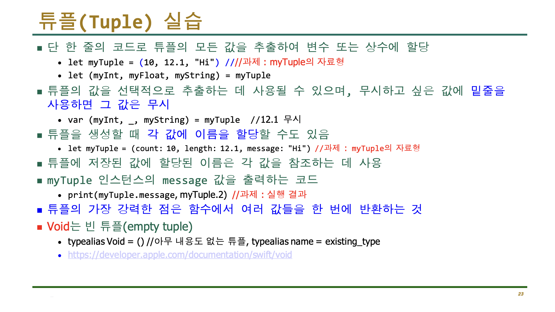 | 이름 (Name) | Swift에서는 튜플의 각 구성요소에 이름을 붙일 수 있습니다. 이렇게 하면 인덱스 대신 이름을 사용하여 값을 추출할 수 있습니다. 예: (number: 1, greeting: "Hello")에서 number, greeting이 각각의 이름입니다. |