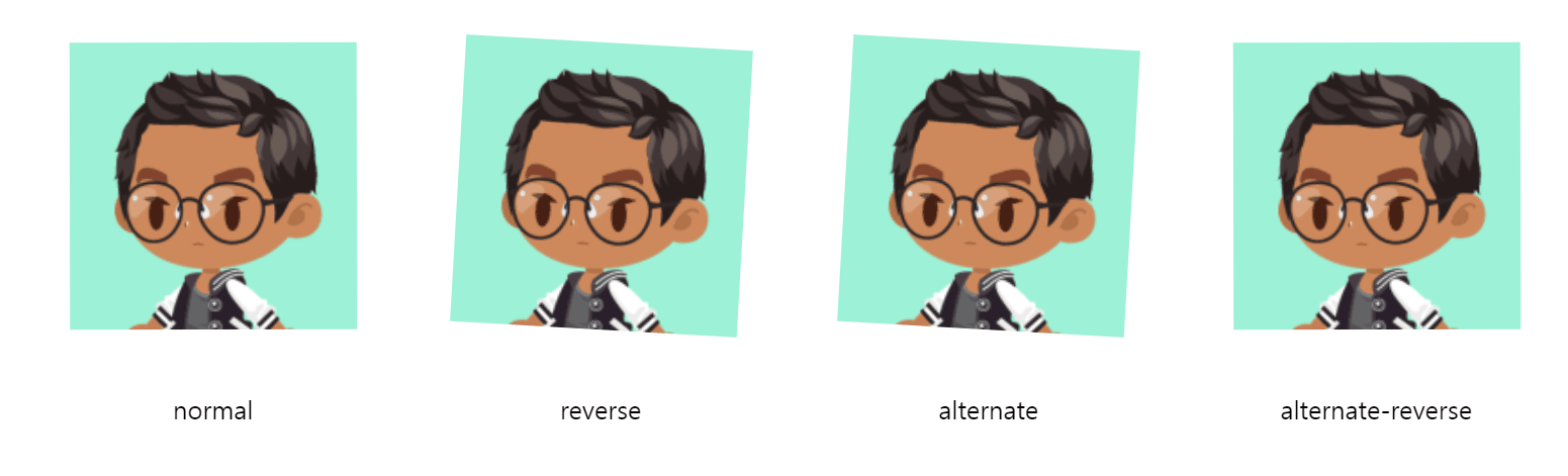 역시 animation 속성에 띄어쓰기로 구분해준 다음, 혹은 animation-direction 이라는 속성으로 작성