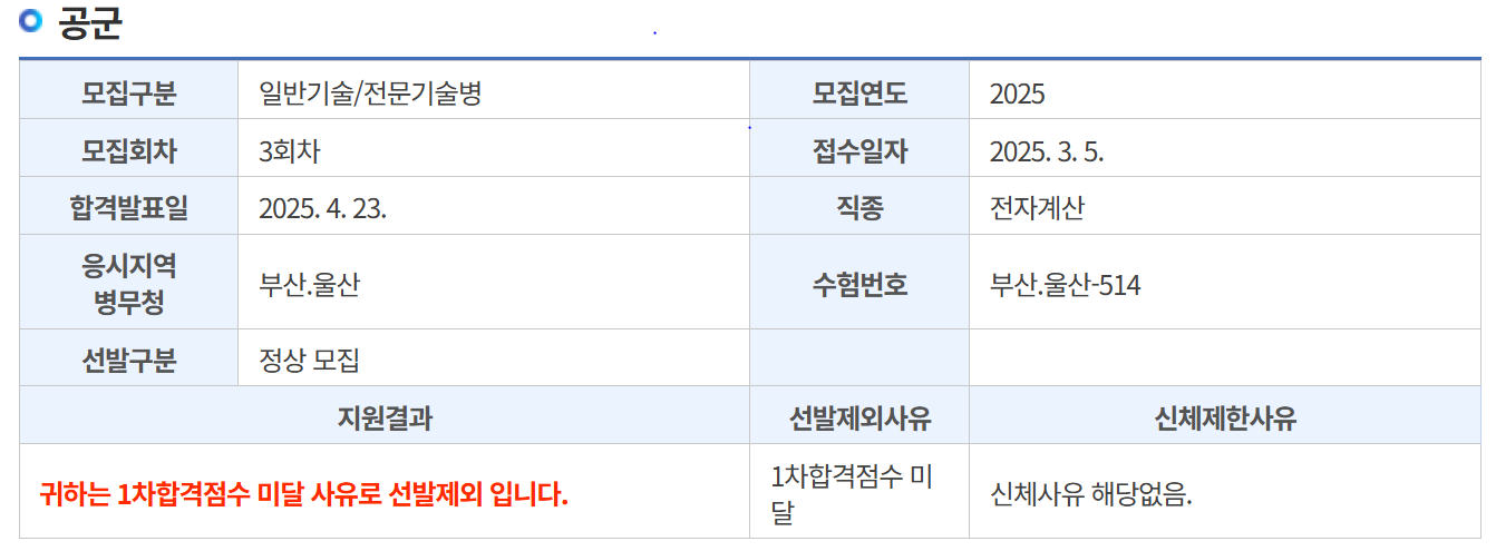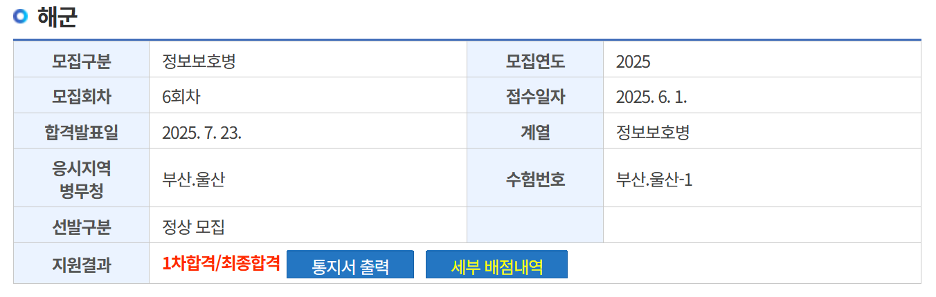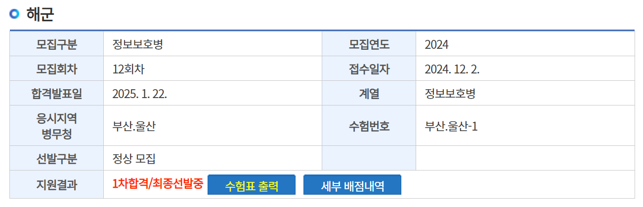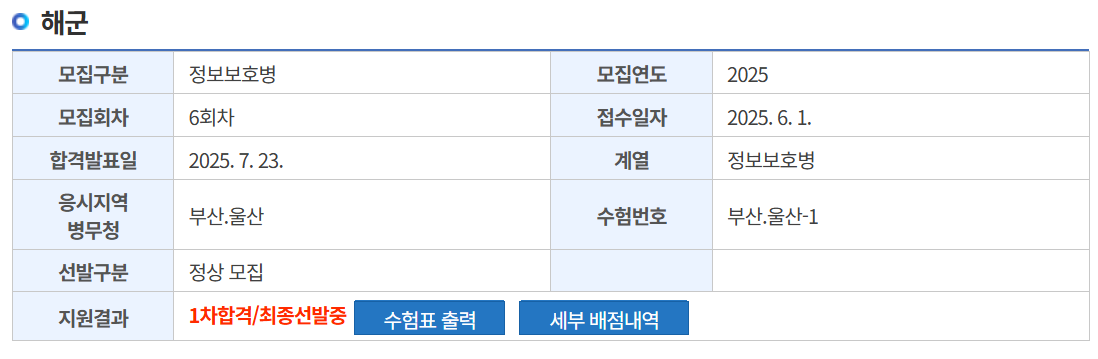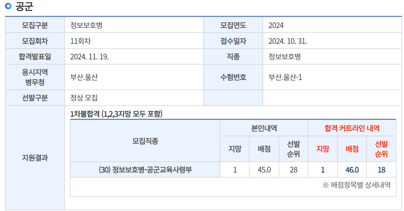 이번 해군 정보보호병의 경쟁률이 5명 모집 6명 지원하여 1.2:1로 낮았기 때문에 가장 합격할 가능성이 높은 선택지였다. 해군 정보보호병은 2023, 2024년의 8, 9월은 모두 미달이었으나 이번에는 8월 해군 모집이 없어서 그랬는지 미달나지 않았다. 그러나 1차 점수가 4등으로 1배수 내에 들어왔기 때문에 내가 7수하면서 넣은 곳들 중에 가장 가능성이 높은 곳이었다.