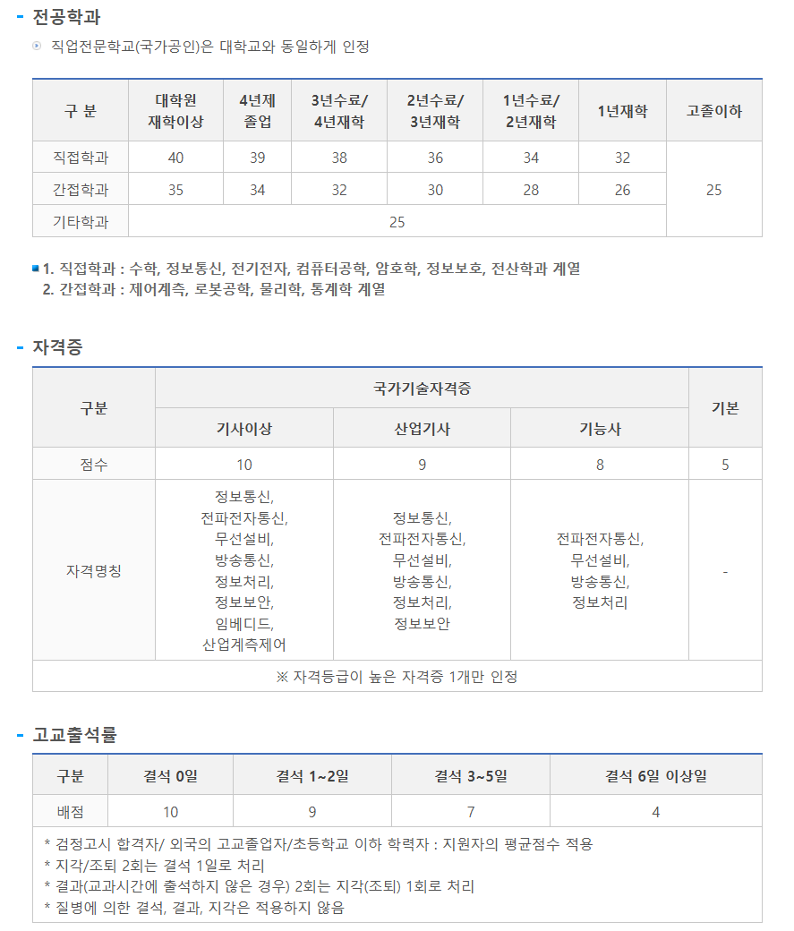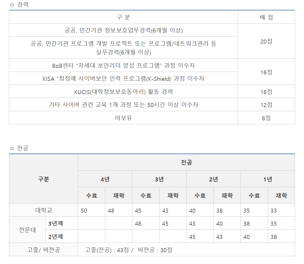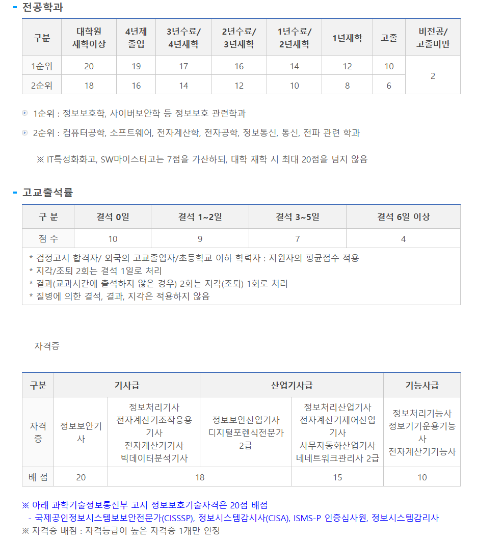 : 컴퓨터공학과 3학년 재학 = 정보보호학 전공 1학년 재학과 같은 점수다. 이게 정말정말 큰 차이를 만든다. (학교에 보안학과가 있다면 복수전공 추천)