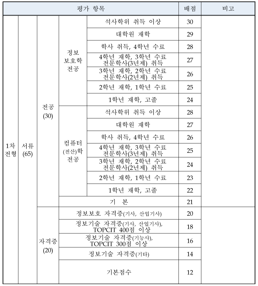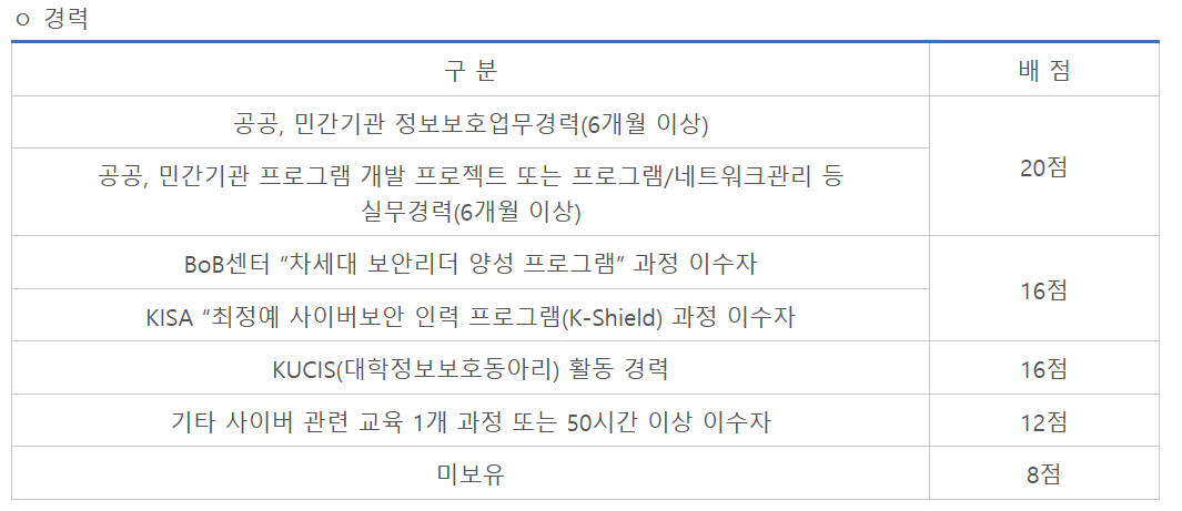 : 보안 경력자거나, BoB나 K-Shield 출신이 아니면 이 부분을 대부분 지원자들이 관심을 많이 가지지 않는 것 같다. 여기에 '기타 사이버 관련 교육 1개 과정 또는 50시간 이상 이수자' 항목이 미보유 대비 4점을 주기 때문에 나는 자격증에서 인정 못받은 점수를 여기서 채웠다.
