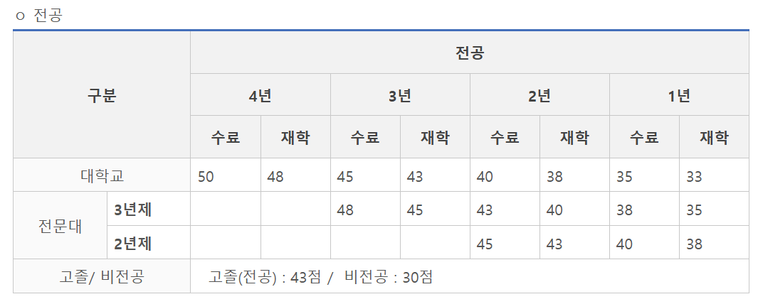 : 나는 직접학과에 2학년 수료였다. 신호정보병은 2학년 수료 = 3학년 재학과 같은 점수이다. 또한 이보다 높은 학년은 점수 차이가 1점씩 밖에 안나고, 낮은 학년은 2점씩 차이난다.
