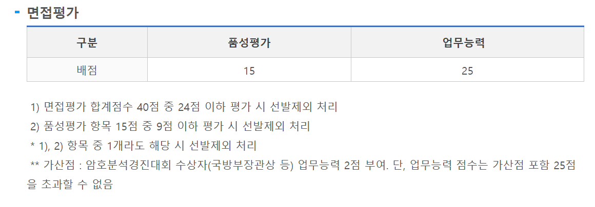 육군 정보보호병은 각각 다음과 같은 항목을 평가한다. 여기서 직무능력평가 중 20점은 필기 시험이고, 나머지 10점과 각 항목 10점이 면접 평가이다. 면접 준비할 때 후기를 많이 참고했었는데 기술 질문, 국가관, 인성 질문 등 두루 나왔었다.