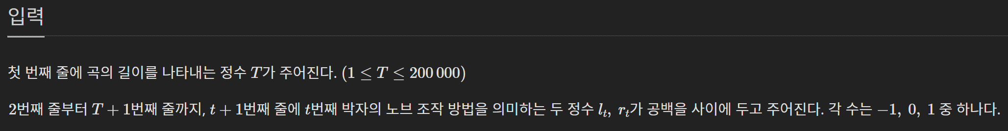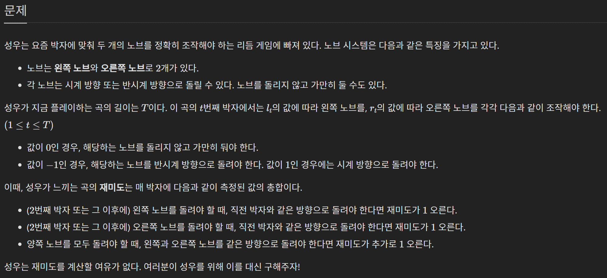 재미도를 측정하는 방법을 보면, 2번째 박자 또는 그 이후라는 조건이 달려있는 부분이 있으므로 2번째 시도부터 그 lt와 rt에서 이전의 방향을 보고 같은지 판별했고, 노브를 돌리지 않고 가만히 두는 경우는 제외해야한다.
