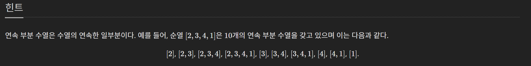 힌트에 있는 연속 부분 수열 예시를 들어보면