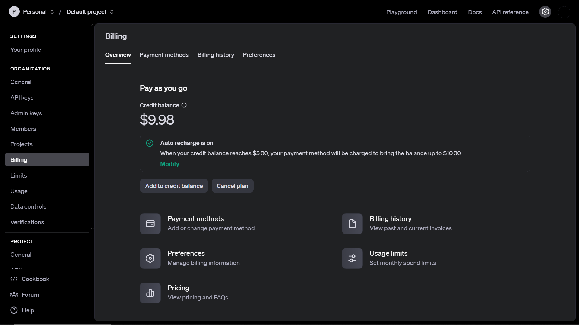 API 홈페이지 → 우측 위 Settings → Billing → Payment methods → Add payment methods
