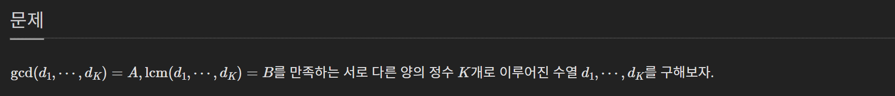 gcd, lcm이 각각 a, b가 되려면 a, b가 직접적으로 들어가 있을 때 반드시 성립할 수 밖에 없다. 이는 조건을 만족하는 수열이 여러개라면 아무 수열이나 출력하라는 조건이 있기 때문에 이 접근이 가능하다.