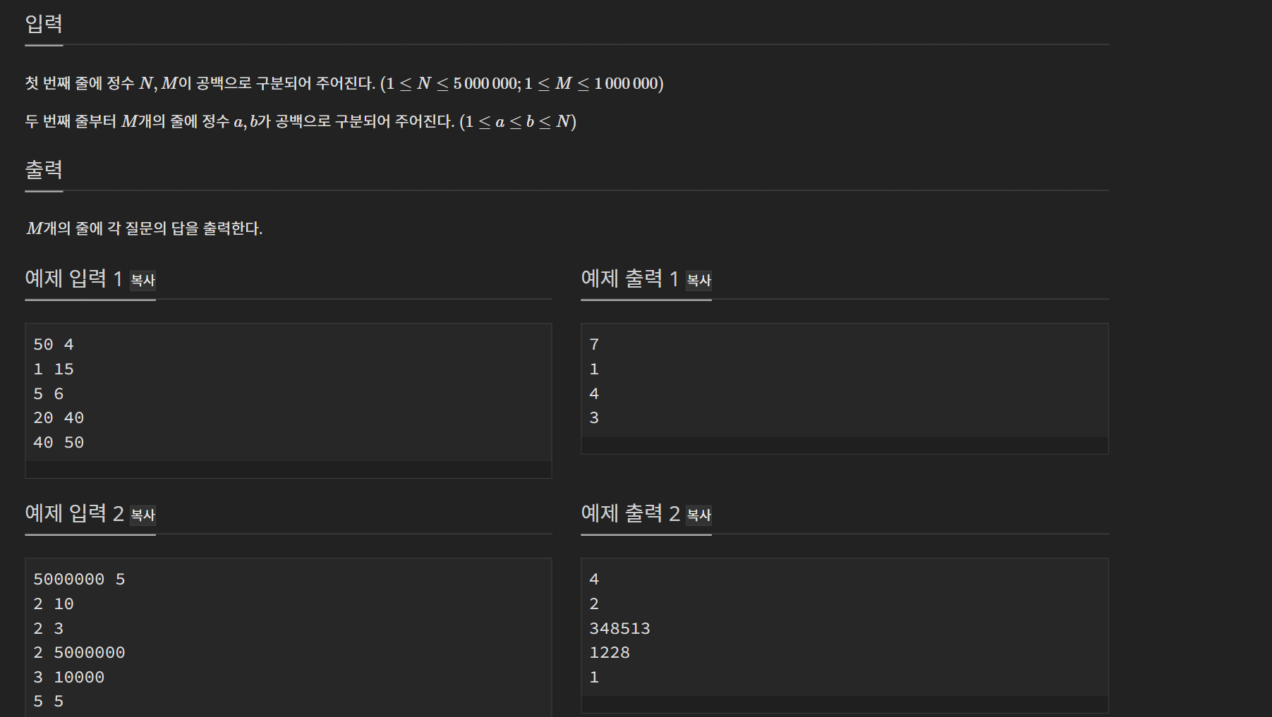 하지만, 이 문제는 1초 시간 제한이 있기 때문에 이 불가하다. 이 말은, 정의를 기반으로 한 기존의 소수 구하는 방법으로는 시간 초과 때문에 구할 수 없다는 것이다. 따라서, '에라토스테네스의 체' 라는 1~n까지의 소수를 빠르게 구할 수 있는 방법을 사용해서 구해야한다. 하지만, 이것 만으로는 제 시간안에 돌아가지 않았는데, 이는 M의 범위 때문이다. 이기 때문에 만약 리스트 슬라이싱을 통해 count를 하는 경우 만큼 시간을 더 쓰면서 시간 초과가 난다. 그래서 나는 초반 시간이 조금 소요되더라도 최악의 경우에 더 빨리 사용할 수 있도록 누적합 배열을 만들어 놓고, b 구간의 소수 갯수 - a구간의 소수 갯수 해서 구해줬다. 그리고, 디테일하게는 범위가 a 이상, b이하이기 때문에 a, b 둘 다 포함해야한다. 하지만, (5, 5) 같은 입력이 들어왔을 때 같은 값 - 값은 값이니까 0이 나온다. 그래서 이러한 경우까지 포함해주기 위해 a-1 구간의 소수 갯수로 구해줬다.