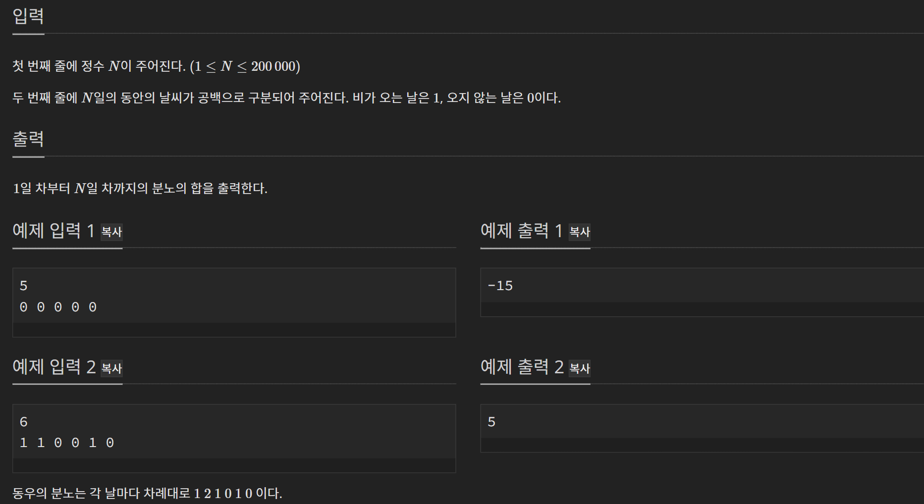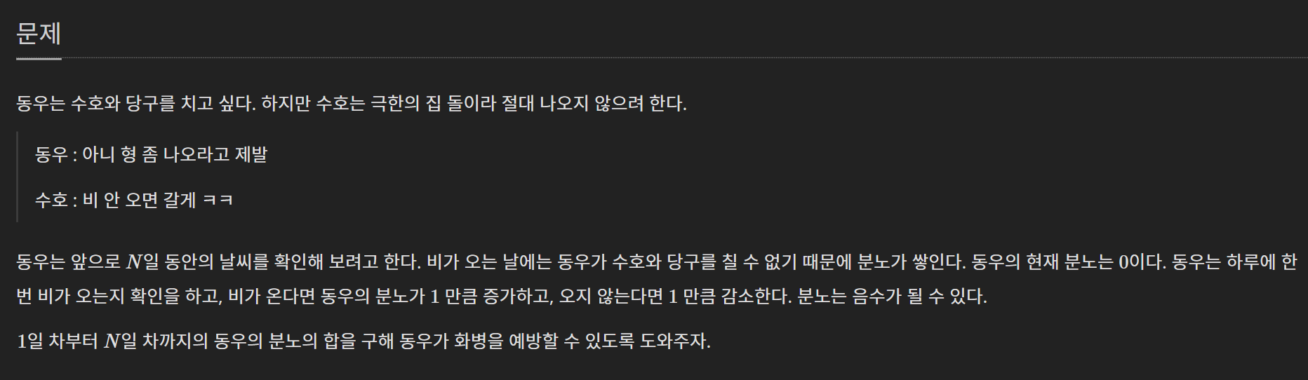 나는 처음에 마음이 급했던 탓인지 n일차까지 분노의 합을 구하라고 했는데, 분노의 결과값을 구하는 것으로 잘못 해석해서 한번 둘러갔다. 이러한 일이 없으면 빠르게 풀 수 있을 것이다.