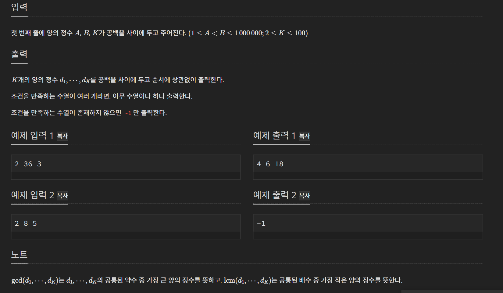 대회때는 시간 초과 함정이 있는 문제라고 생각했어서 문제만 이해하고, 시도해보려다가 포기했다. 내가 대회때 햇갈렸던 부분은 예제 출력1 때문이었다. 출력 자체는 이해 할 수 있었는데, 저 값을 뽑아내려면 2의 배수, 36의 약수로 줄여도 k개의 for 중첩문으로 다 확인해야할 것 같아서 시간초과가 날 것 같았다. 이 부분이 함정이었다.