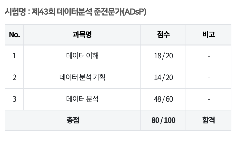 데이터의 이해 부분은 나름 경력이 있다고 눈에 익는 단어들이 많아서 이해가 잘 됐는데 점수를 높게 받아서 기분이 좋고, 3과목 데이터 분석쪽을 풀면서도 과락하면 어쩌지.. 했는데 다행이도 내가 선택한 답이 정답인 경우가 많았나보다.