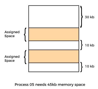 위의 그림을 보면 30KB, 10KB, 10KB 총 50KB메모리가 남지만 45KB의 메모리가 필요한 프로세스는 남은 메모리를 할당 받을 수 없다.