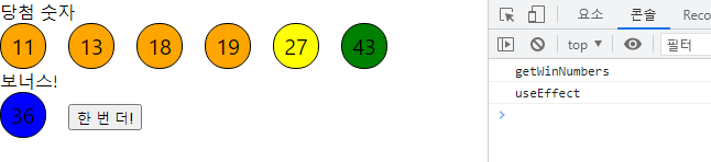 3번 항목까지 진행하였을 때 콘솔 창을 보면, getWinNumbers가 연속으로 실행되고 있다. Hooks의 특성 때문에, 함수 전체가 처음부터 다시 실행되는 현상이 반복되기 때문이다.