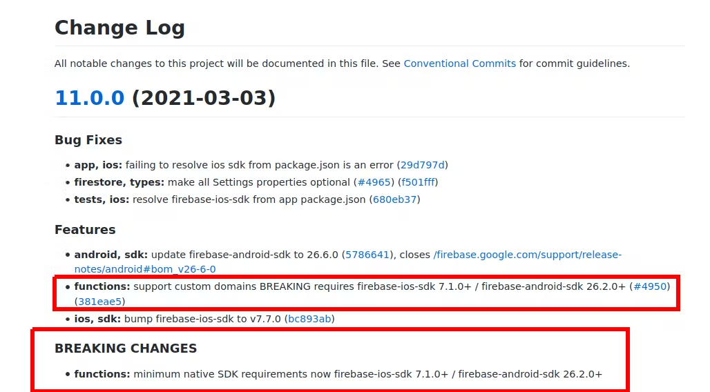 functions 항목에 breaking change가 있는 것을 볼 수 있으며, 필요한 경우 실제 커밋을 추적할 수 있다. 그리고 firebase-ios-sdk와 firebase-android-sdk에 대한 최소 버전 요구 사항이 높아짐에 따른 충돌이 있을 수 있음을 분명히 전달한다. SDK 버전을 기본값에서 override한 경우, 잘 호환되는지 확인하거나 react-native-firebase v11을 채택할 때까지 기다려야 하지만, 둘 중 어느 쪽이든 필요한 작업은 명확하다.