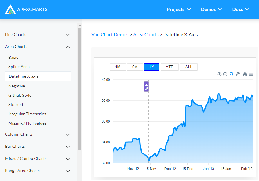 vue-apexcharts는 문서화가 매우 잘 되어 있었고, 데모 페이지에 내가 구현하고자 했던 차트와 유사한 예제(Datetime X-axis)가 제공되어 있었다. 추가 커스터마이징이 거의 필요 없어서 빠르게 적용할 수 있었으며, 간단한 API 덕분에 사용하기도 매우 편리했다.