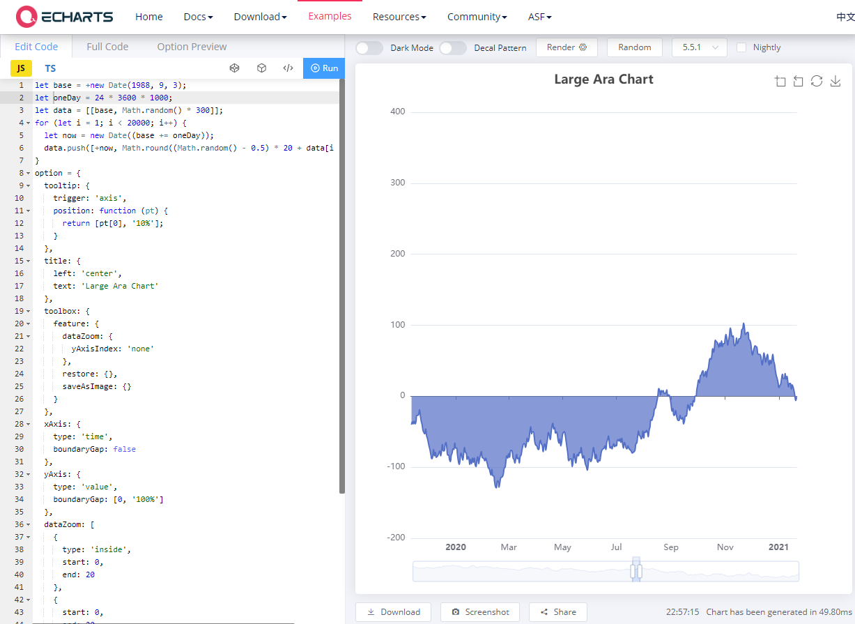 vue-echarts는 데모로 zoom이나 pan 기능을 탑재한 시간대별 그래프 만드는 법이 나와 있기도 하고, 대용량 데이터 처리에 탁월한 성능을 가지고 있다고 하여 선택하려고 했다. 하지만 실제 설정 과정에서 복잡함을 느꼈고, 초보자가 사용하기에는 난이도가 높았다. 문서화도 다른 라이브러리에 비해 직관적이지 않아 빠른 속도로 프로젝트를 진행하는 데에는 적합하지 않다고 판단하였다.