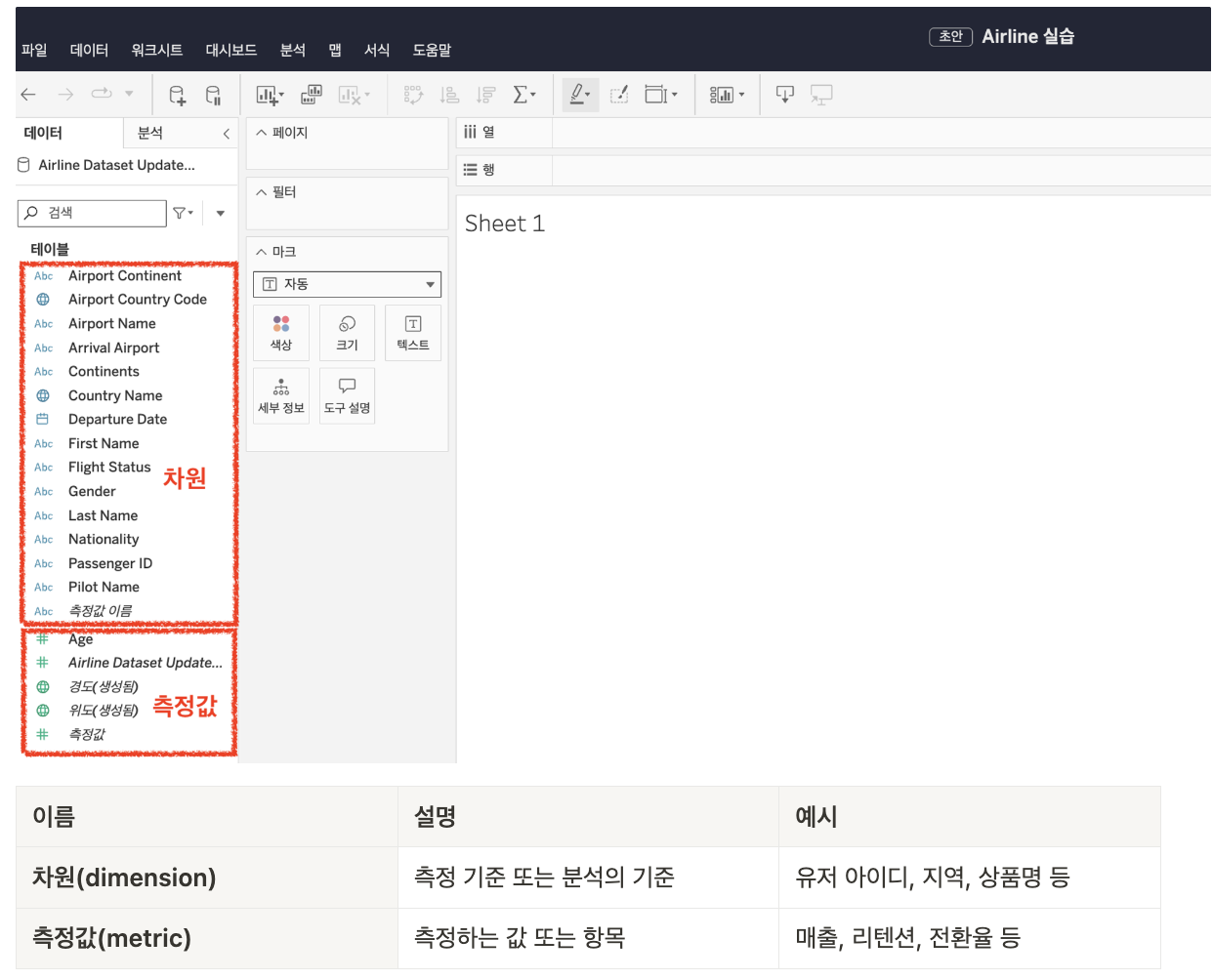 차원과 측정값은 열이나 행에 드래그앤드롭으로 활용