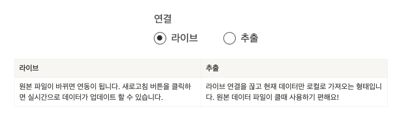 커넥터 연동시 특히 SQL 쿼리를 사용할 경우, 라이브 연결 대신 추출 연결로 선택하는 것이 태블로 대시보드 만드는 시간을 줄일 수 있어요!