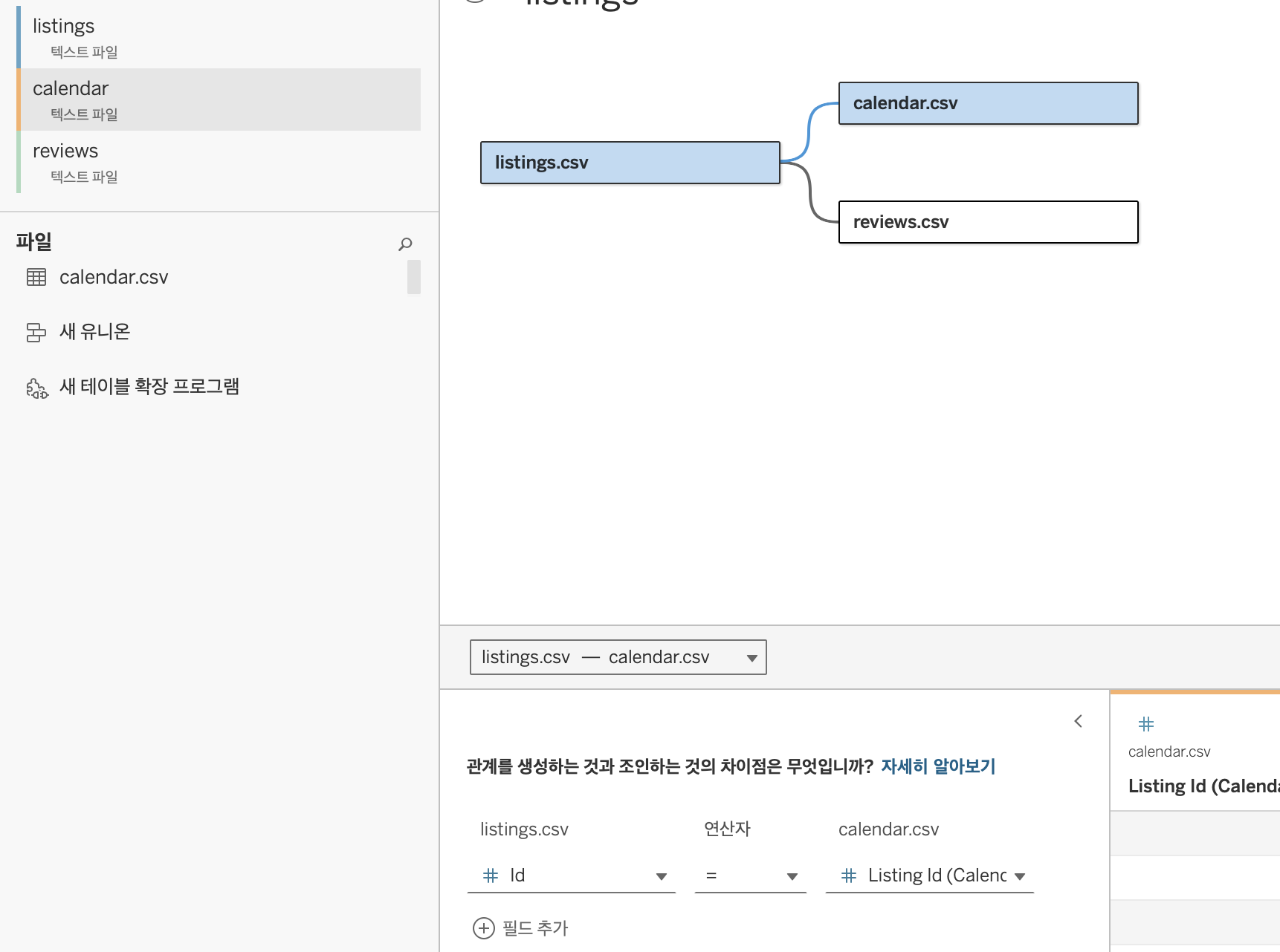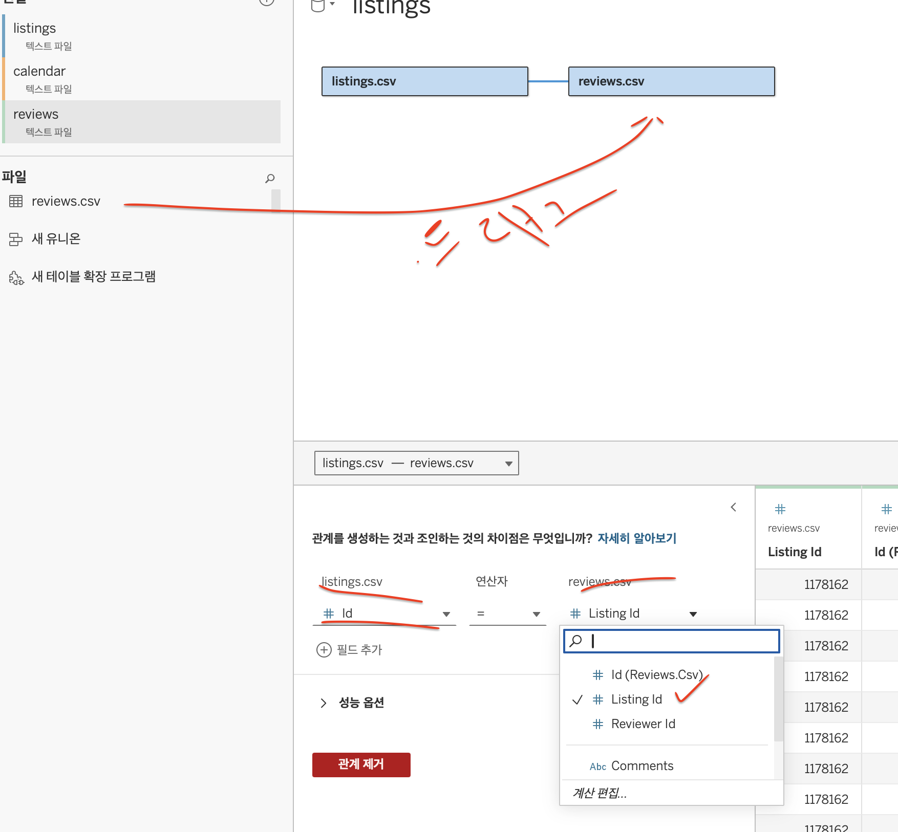 ✅ listings 테이블의 공통키를 중심으로 3가지 테이블의 관계를 만들어주세요!**
