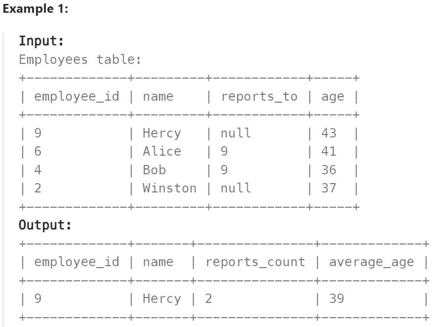 한 명 이상에게 보고 받는 매니저의 employee_id, name, reports_count(보고자 수), average_age(보고자의 평균 나이)를 구하여라.- 조건: