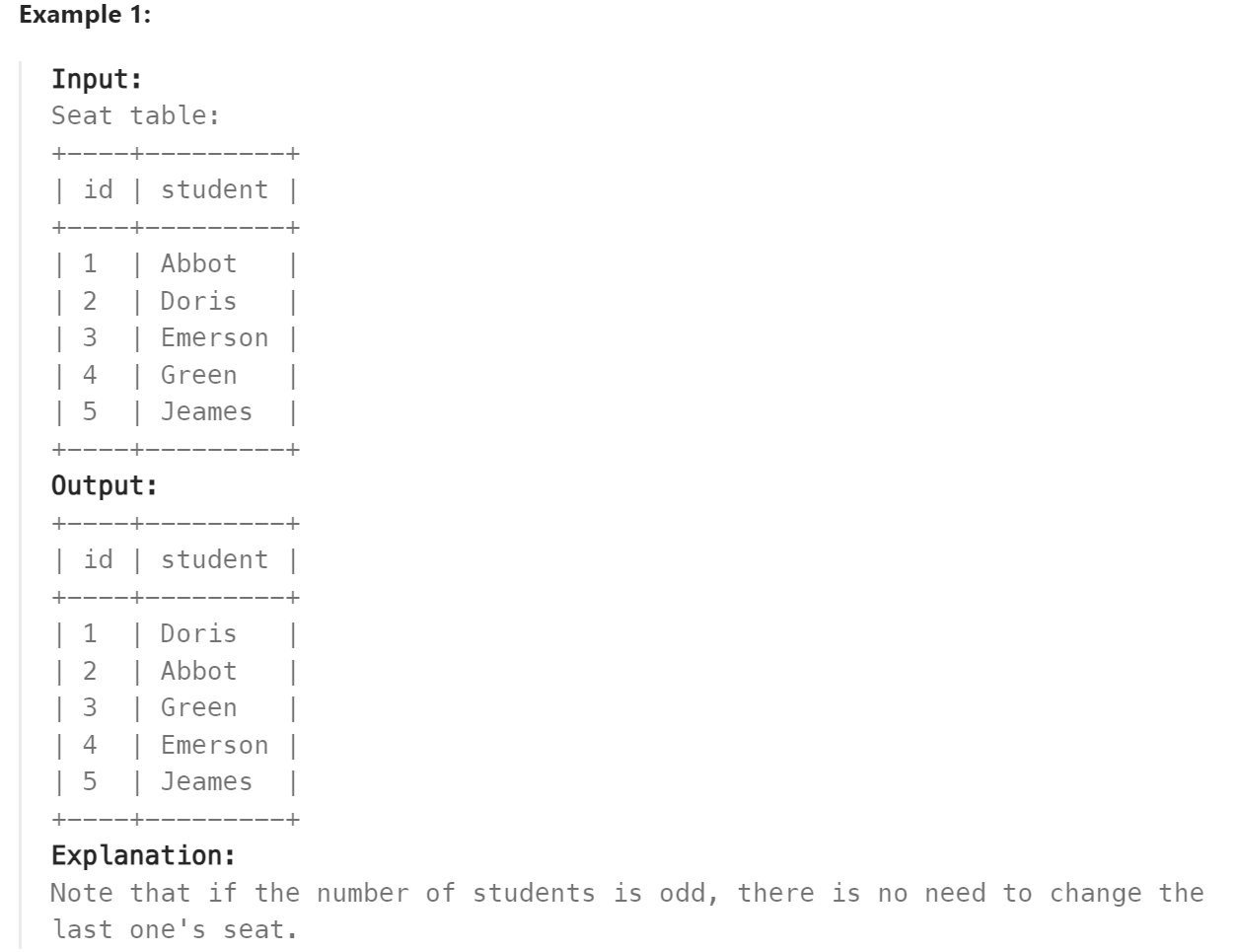1번 좌석과 2번 좌석의 학생을 바꾸고, 3번과 4번 좌석의 학생을 바꾸는 식이다. 만약 총 좌석 수가 홀수라면, 마지막에 짝이 없는 학생은 그대로 두는 조건이다.