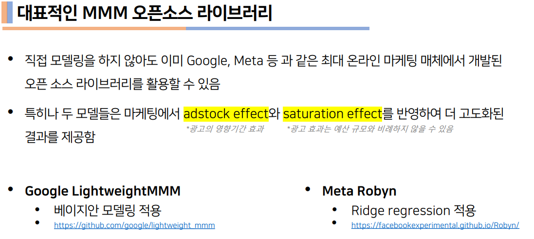 - MMM을 활용하면 각 매체의 기여도와 광고의 Incremental 효과를 측정 가능하여, 마케팅 효율성을 더 정확히 분석할 수 있음.
