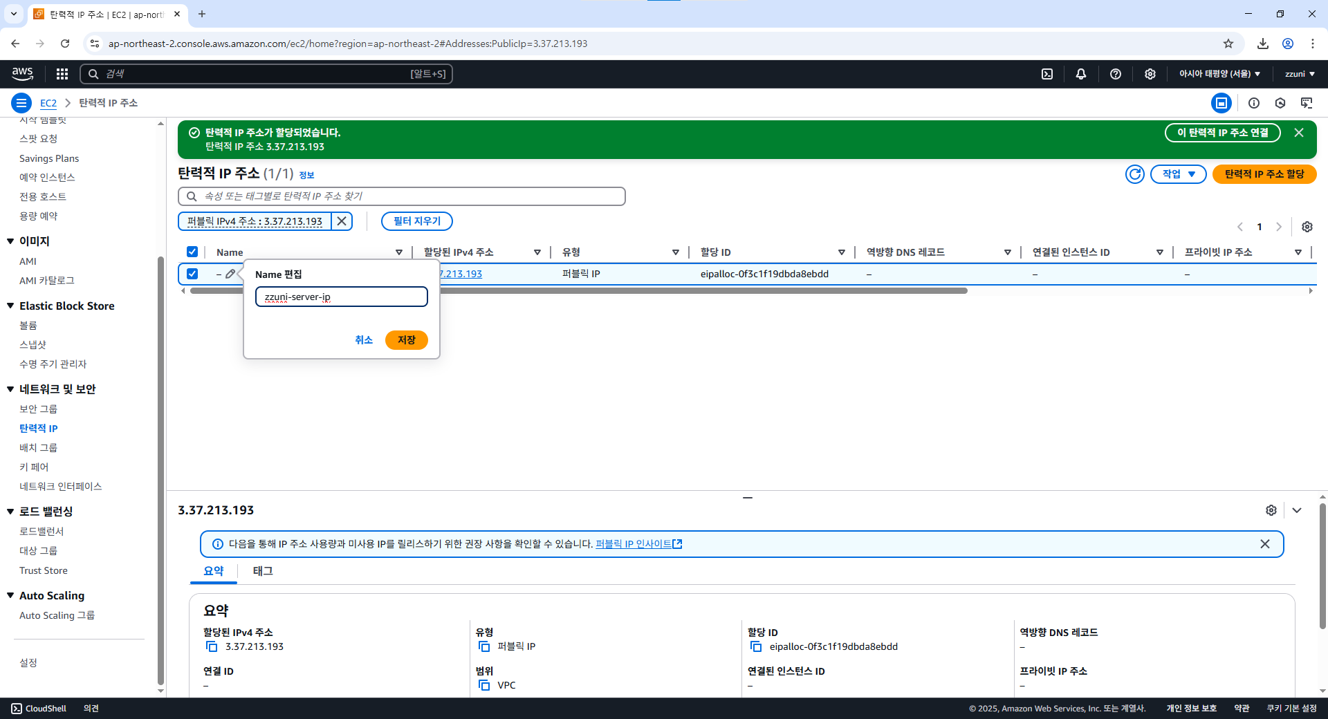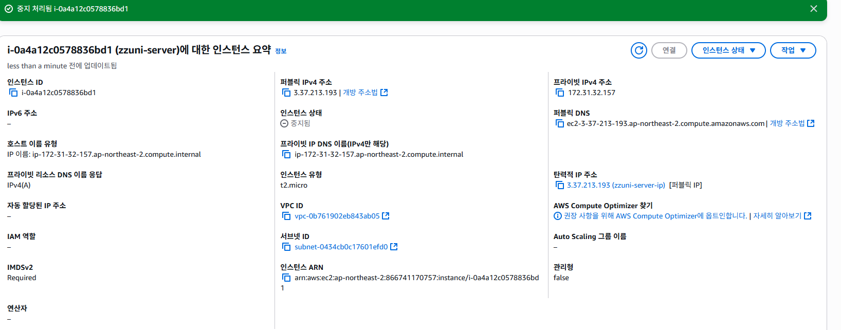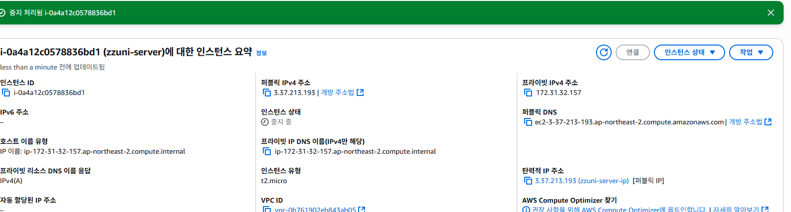 실행중 상태 변화가 되어도 ip주소가 바뀌지 않는 모습