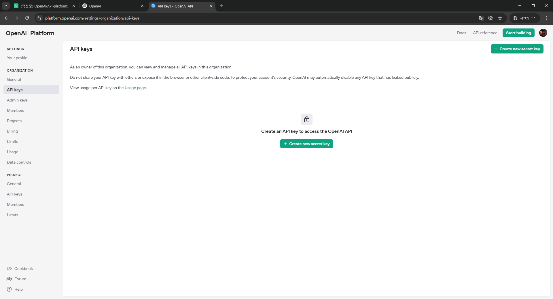 API KEYs 화면에서 새로운 API 키 생성