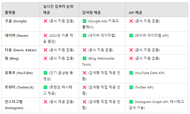 - 여기에 포털 사이트는 아니지만 이에 준하는 역할을 수행하는 유튜브와, X(트위터), 인스타그램, 쓰레드 등의 SNS도 포함하면 더 신뢰할 수 있는 키워드를 추출할 수 있겠다고 생각했습니다.
