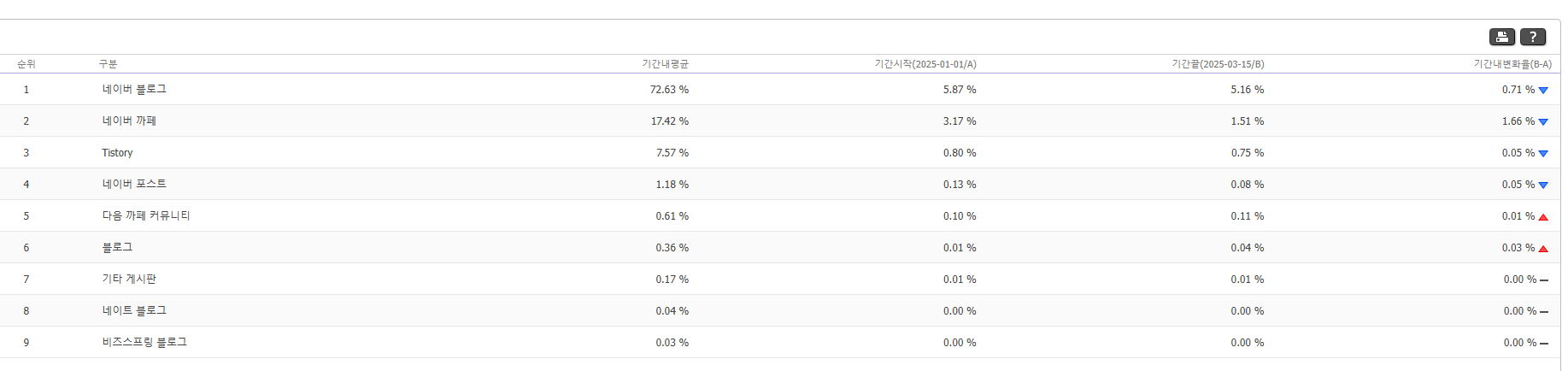 - 인터넷 트렌드 사이트에서 2025/01/01부터 2025/03/15까지 국내 이용자의 포털 사이트 이용률을 나타낸 표입니다. 네이버, 구글, 빙, 다음 순으로 점유율이 높습니다.