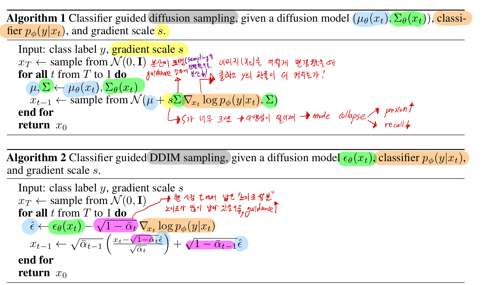 - 알고리즘 1: DDPM 개열에 Classifier Guidance 적용