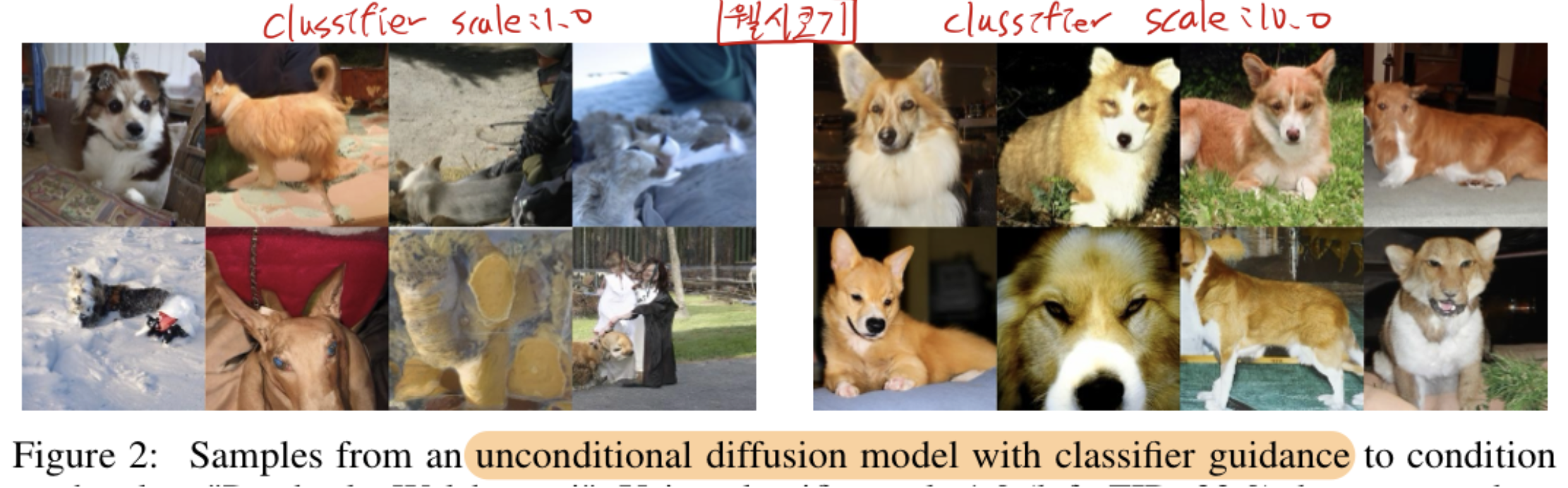- 즉, 클래스 라벨을 직접적으로 모델에 넣어서 학습한 뒤, 거기에 추가로 분류기 그래디언트를 더하면, 더욱 확실한 조건부 생성이 가능하다는 뜻입니다.