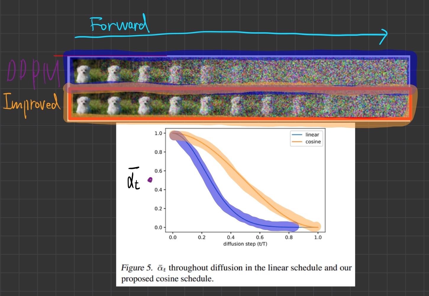 - 첫번쨰 줄(linear schedule): 중간 단계에서부터 벌써 almost noisy