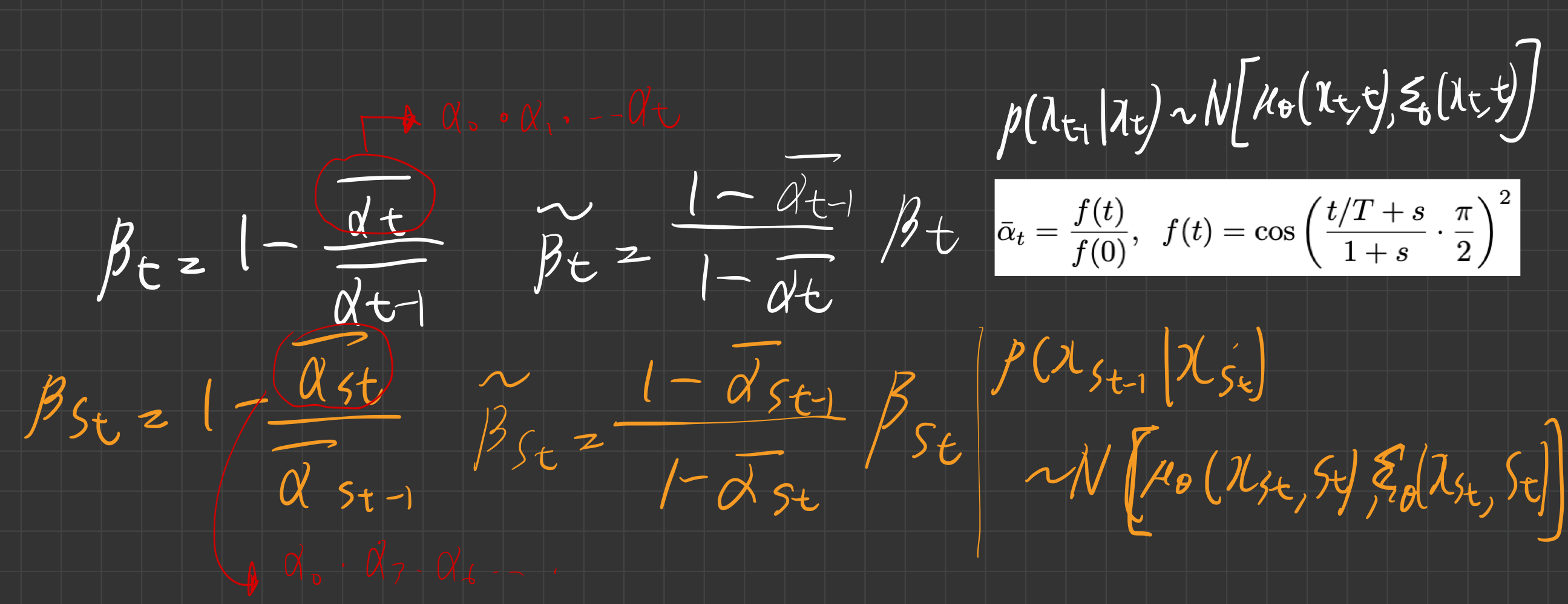 - 평균: μ~t=1−αtαt−1βtx0+1−αtαt(1−αt−1)xt