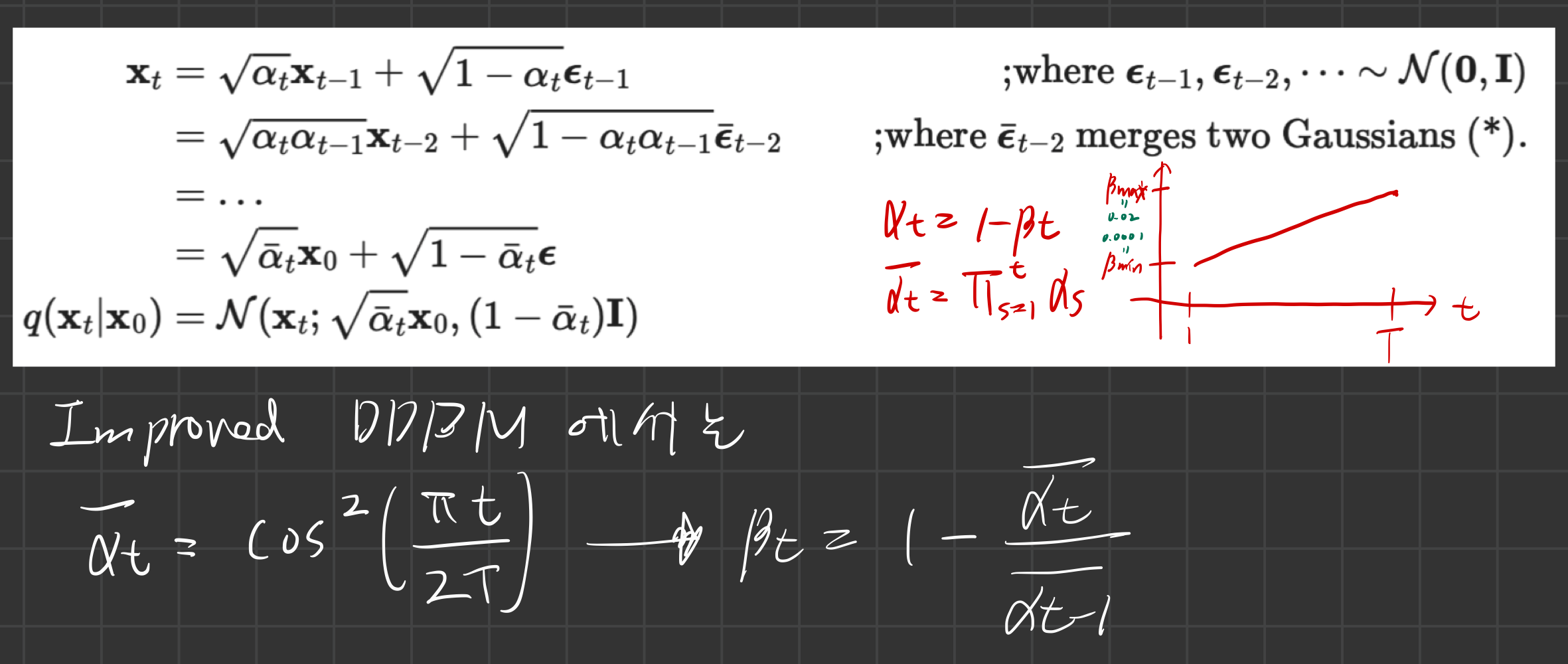 - 우리는 DDPM에서 Bt를 linear schedule로 설정하였습니다.